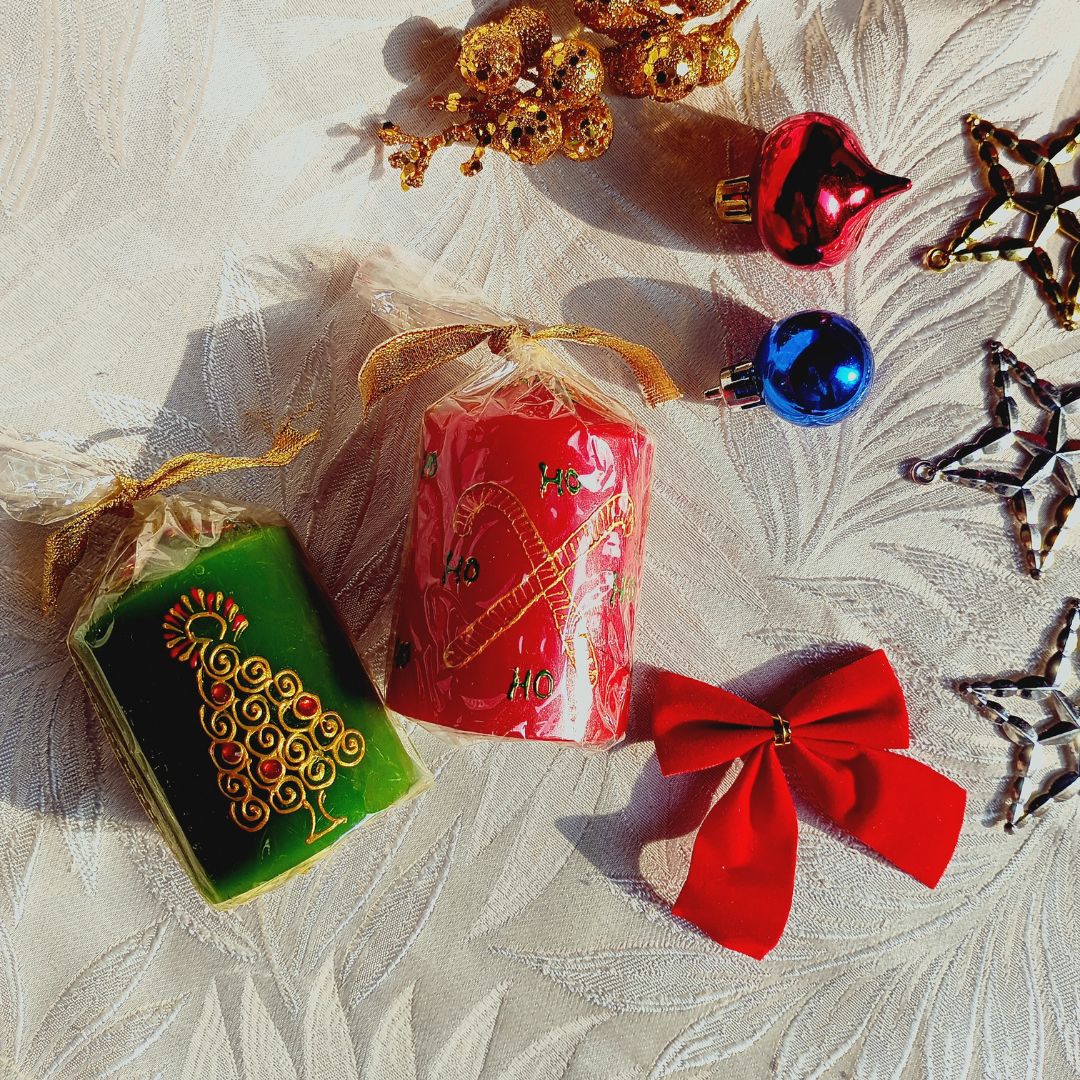 A charming set of 2 decorative candles in classic Red and Green, perfect for adding a festive touch to any room or holiday setup.